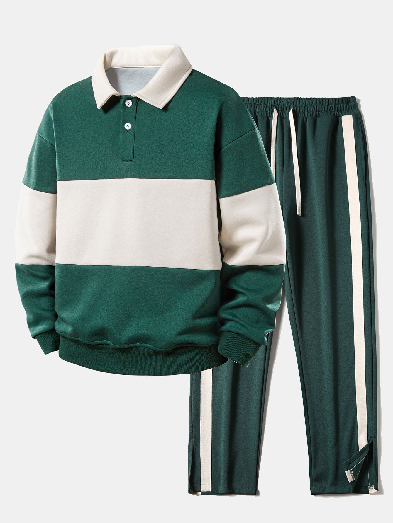 Relax Fit Color Block Polo Collar Sweatshirt & Slit Hem Stripe Pants