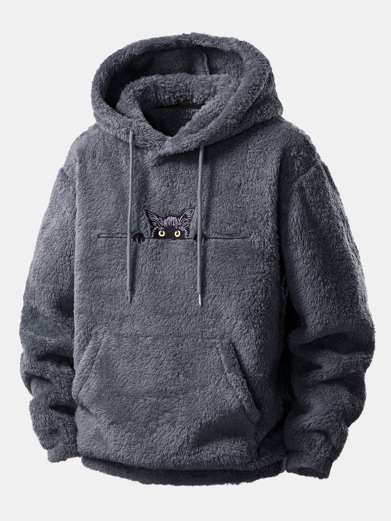 This cozy hoodie is crafted from soft, plush sherpa fleece for a warm and comfortable feel. A playful embroidered black cat peeking out from the chest brings a fun and unique detail to the minimalist design. Featuring a loose fit, kangaroo pocket, and adjustable drawstring hood, it combines style and practicality—ideal for casual outings or lounging in comfort.